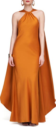 Indulge your flair for the dramatic in a showstopping gown designed with a capelike flourish to finish the back.
