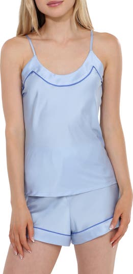 Stretchy satin lends a luxurious feel to this camisole and shorts pajama set trimmed with contrast piping.