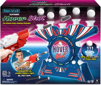 AMBASSADOR GAMES: RETRO ARCADE: HOVER SHOT - The ultimate target shooting challenge game is back and better than ever! Hover Shot 2.0TM has all the fun of the original Hover ShotTM game, with major upgrades in performance! In this target shooting game each person tries to hit the most targets, however these are not normal targets! Turn on the Hover Shot 2.0TM machine and 5 balls are suspended in mid-air by a current of wind! For an extra challenge turn off the lights and the floating balls grow in the dark! INCLUDES a powerful, precision blaster, 2 performance darts, 1 target, and 5 foam balls. Take aim & fire! How many shots do you need to KNOCK all the floating balls out of the AIR? For 1-2 players. Requires 4 x 1.5V C batteries (not included). Recommended for ages 6 and over.