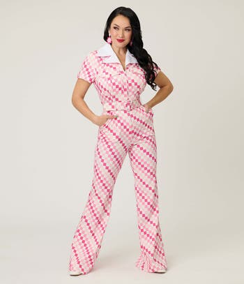 This adorable 1970's style jumpsuit is crafted in a brilliant woven blend. Featuring a matching belt to cinch the waist and complete with a front zipper and side, back, and front pockets!