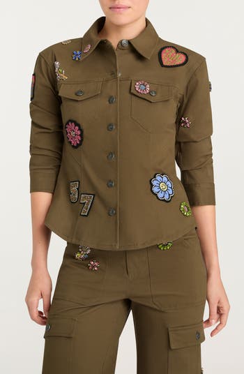 Eye-catching patches level up this retro jacket that boasts uniform-inspired details and ruched sleeves, creating a contemporary look both functional and fashionable.