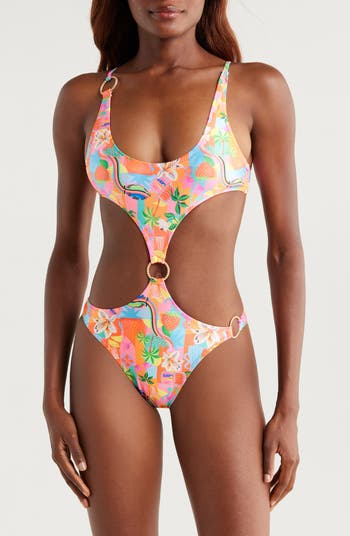 Flirty cutouts with glossy rings lend beachy flair to this printed one-piece swimsuit designed with sunny high legs and cheeky back coverage.