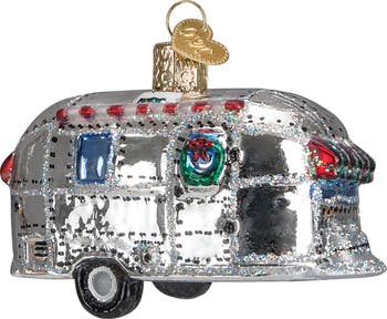 Bring a hefty dose of retro charm to your holiday tree with this hand-painted and mouth-blown glass ornament in the shape of a glitter-dusted vintage trailer.