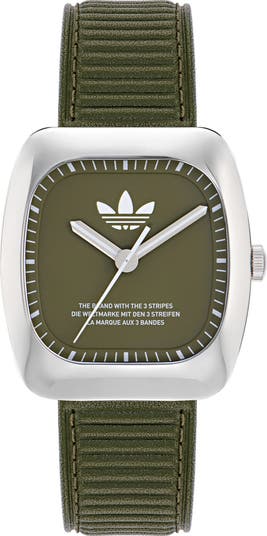 A textured leather band and heritage Trefoil create a look of sporty refinement on this everyday watch marked by stick indexes on a wide, easy-to-read dial.
