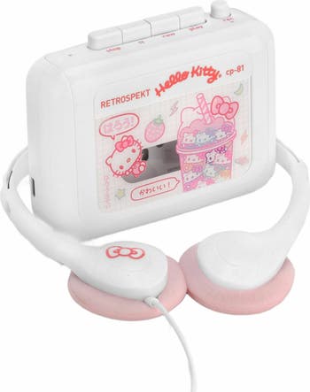 - Features include: Play, fast-forward, rewind, record Microphone jack Headphones jack Type-C USB power supply Battery operable Contents include: CP-81 portable cassette player 2x AA batteries Hello Kitty adjustable headphones User guide