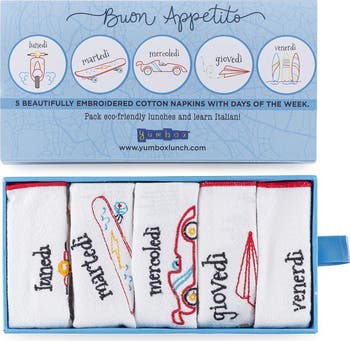 - Set includes 5 reusable cotton napkins embroidered with Italian days of the week—perfect for eco-conscious lunch packing Made from 100% soft cotton with red trim and colorful illustrations—fun and functional for kids and families Each napkin measures 9.5" x 9.5" (24 x 24 cm)—ideal size for lunchboxes, snack bags, or table settings Machine washable and easy to care for—just toss in the wash and reuse daily for a waste-free routine Packaged in a charming matchbox-style gift box—great for gifting and storage