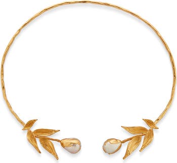 The Reva Choker is handcrafted and accented with baroque shell pearls. Designed with an open ended, textured and highly flexible band, it makes a statement at the collar and adjusts easily for a snug fit. Suitable for festive occasions and evening wear. Available in silver rhodium-plated or 22k gold-plated brass