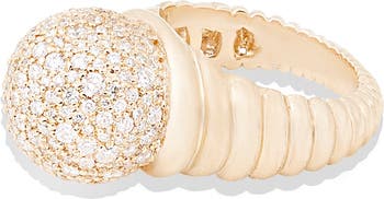 A playful take on the cocktail ring, the Revel Bobble Cocktail Ring features a large sphere completely covered in pave set diamonds. The sphere rests in a bold band covered in our signature ribbing detail, adding a sculptural and dimensional element to this whimsical design.