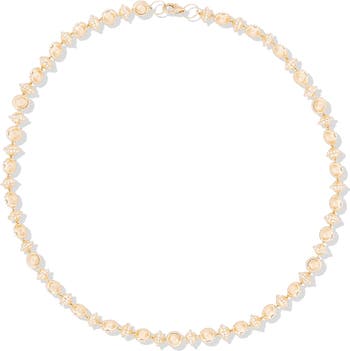 A true collector's piece, the Revel Small Bead Necklace is constructed of small gold beads, each featuring a row of sparkling tsavorites or rhodolite garnet around the diameter of the bead.The necklace is assembled using a playful approach of alternating vertical and horizontal stone orientation as well as stone color on each bead, leading to a distinctive and unexpected pattern in the stone detail. This piece is a modern approach to a classic silhouette - a true statement piece you will wear and love.