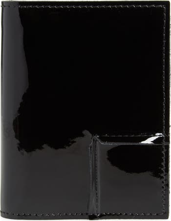An upturned corner brings a modern twist to a slim card case fashioned from glossy patent leather.