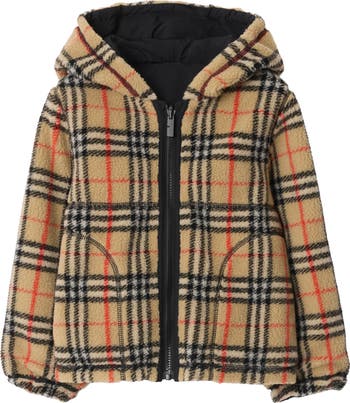 A reversible hooded jacket that switches from solid colour nylon to cosy fleece in sand beige Burberry Check.||Zip closure|Side zip pockets|Elasticated hood, cuffs and hem