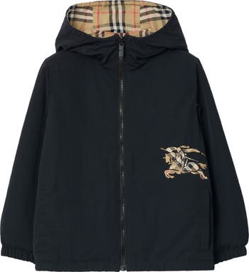 A lightweight jacket in nylon with a hood for unpredictable weather. The style reverses from the Burberry Check to a solid colour and is appliquéd with our Equestrian Knight Design.||Zip closure|Side zip pockets|Elasticated hood, cuffs and hem