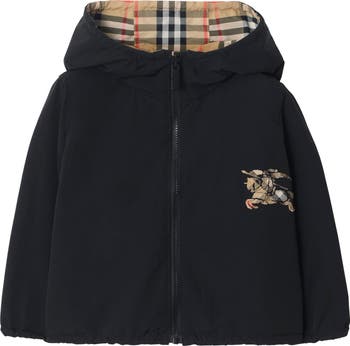 A lightweight jacket in nylon with a hood for unpredictable weather. The style reverses from the Burberry Check to a solid colour and is appliquéd with our Equestrian Knight Design.||Zip closure|Side zip pockets|Elasticated cuffs and hem