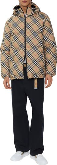 A hooded puffer jacket filled with goose down and feathers, cut to a relaxed fit. The reversible design switches from Burberry Check to a solid colour nylon and is appliquéd with our Knight stamp, an archival motif first seen on Burberry bags in the 1980s.||Two-way zip closure|Drawcord hood and hem|Side zip pockets|Elasticated cuffs|Silicone patch with Equestrian Knight Design at sleeve|Comes with a garment bag