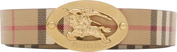 A belt made in Italy from a coated cotton blend, woven with the Burberry Check in our signature archive beige colourway. The design reverses to grainy calf leather and features a metal buckle detailed with our logo and cut-out Knight stamp, an archival motif from the 1980s.