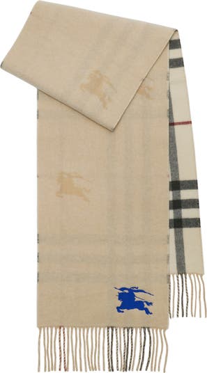 A scarf in double-faced cashmere, made at a Scottish mill founded in 1797. The reversible style switches from the Burberry Check to a solid colour woven and embroidered with our Equestrian Knight Design. The fabric is washed in local spring water and brushed with teasels – dried flowers that are drawn along the surface of the cashmere to ‘raise’ the cloth, creating a natural lustre and ultra-soft finish.||Rectangular |Fringing at both ends