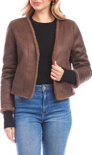 An open front creates easy layering in this reversible cropped jacket made from rich faux suede with a furry contrast.