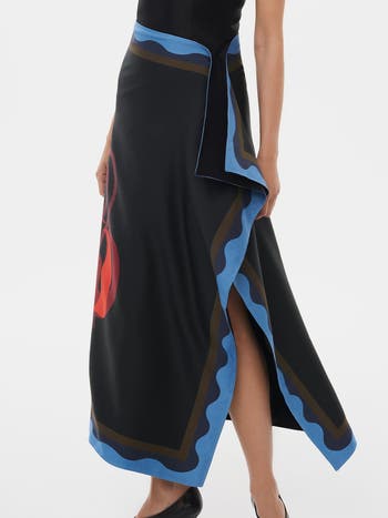 Reversible midi-length wrap skirt in premium wool blend, with a double-layer construction for structure and volume. A row of fabric-covered buttons allows a one-size fit, adjustable to suit various body types and styling preferences. Features original artwork created by Lina Disciplina. Designed for two-way styling: wear the print on the outside, or reverse for subtle print details peeking through the side openings.