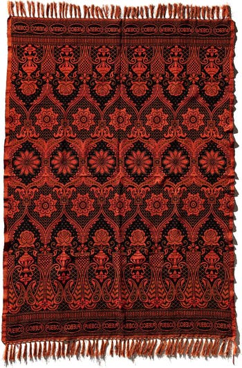 Elevate your space with this striking black and red jacquard rug, featuring intricate patterns and elegant fringed edges. Its bold design and fine craftsmanship make it a timeless piece, perfect for adding texture and sophistication to any room.
