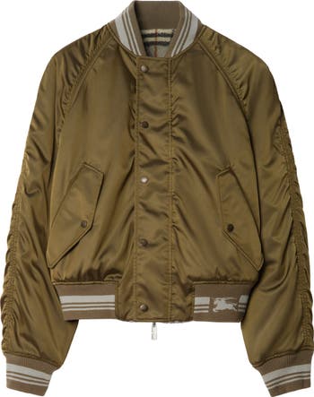 An oversized bomber jacket crafted from lightweight changeant nylon, an archive-inspired fabric woven with contrasting yarns for a subtle sheen. The press-stud design reverses to the Burberry Check in a cosy wool cashmere blend fleece and is framed with striped rib-knit trims.
