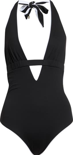 An elasticized strap fits under the bust and ties in back on this sleek reversible swimsuit cut with a plunging halter neck for stylish beach days and poolside lounging.