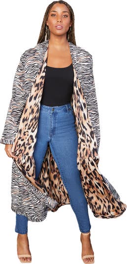 Say hello to your new favorite layering piece. This reversible duster features a statement print on each side, giving you two bold looks in one. Slightly cropped bracelet sleeves balance a long and breezy silhouette.