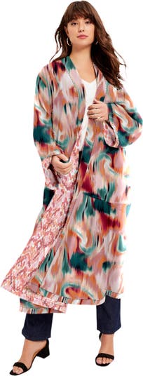 Say hello to your new favorite layering piece. This reversible duster features a statement print on each side, giving you two bold looks in one. Slightly cropped bracelet sleeves balance a long and breezy silhouette.