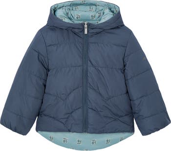 Contains recycled polyester. Long sleeved Puffer jacket for girls. Hooded collar. Front, central zip fastening. Textile exterior with quilted effect. This is a reversible item.