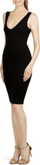 A sleeveless body-con dress crafted in a double-layered knit showcases a deep V-neck that reverses to a scoop neckline for instant versatility.