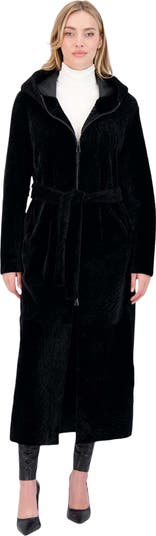 Reversible zip parka features textured Genuine Shearling and a sleek inside, cinched with a belt for a tailored fit—combining versatile warmth with refined style.