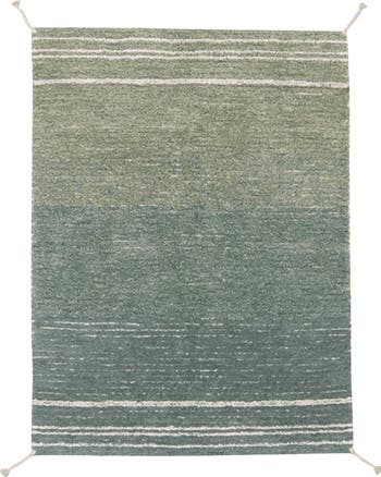 Playing with softly changing color palettes throughout the rug, the Twin rug shows one side in shades of Vintage Blue and Olive and the opposite side in more neutral, natural shades. On both sides the design finish off with horizontal stripes in a contrasted color, and are decorated with natural color handmade braids in each corner.