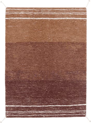 Playing with softly changing color palettes throughout the rug, the Twin rug shows one side in earthy shades of Tooffee and the opposite side in more neutral, natural shades. On both sides the design finish off with horizontal stripes in a contrasted color, and are decorated with natural color handmade braids in each corner.