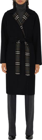 A wool wrap coat made in Italy, reversing from a solid colour to the Burberry Check. Softly tailored to a regular fit with a belt to adjust the shape. Part of Burberry Classics, wardrobe foundations with a unique Burberry slant.||Wrap closure|Side welt pockets; reverse patch pockets|Comes with a garment bag