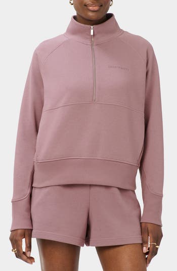 Extended ribbed sections elevate the silhouette of a half-zip sweatshirt mostly made from organic cotton.