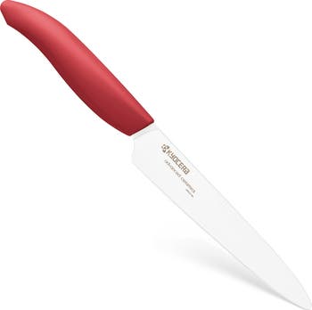 The Kyocera Revolution Ceramic 5-Inch Micro Serrated Tomato Knife makes slicing soft foods effortless. Made in Japan with an ultra-sharp ceramic blade, it glides cleanly through tomatoes, fruits, and breads without crushing. Lightweight, rustproof, and perfectly balanced, this knife stays sharp up to ten times longer than steel.