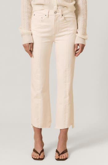 Paneled construction brings a DIY vibe to these '90s-inspired jeans made with a high waist, relaxed straight legs and raw step hems.