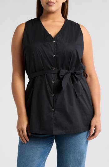 A tie at the waist lets you adjust the fit of this sleeveless cotton-poplin top that looks perfectly chic tucked in or worn long.