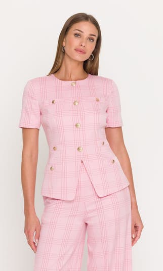 A polished take on suiting, the Reyes Windowpane Jacket features a soft pink plaid, gold buttons, and a sculpted short-sleeve silhouette. Tailored and feminine, this jacket pairs perfectly with the matching skirt or trousers for an elevated daytime look. Self: 65% Polyester, 33% Rayon, 2% Elastane Lining: 95% Polyester, 5% Elastane Professional Dry Clean Slim Fit Gold Ripple Button Length: 25" Back Length 23 3/4", Sleeve Length 8 1/2" Model Size & FitModel wears: US 2/XS / UK 6 / EU 34 Model's height: 5'10″ / 178cm