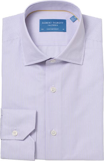 A fresh take on a classic stripe, the Reynolds Contemporary Stripe Twill Shirt is crafted from 100% cotton in a soft twill weave with a subtle sheen. The stripe adds a pop of color, while the edge-stitched Monterey collar and single-needle tailoring bring structure and sophistication.\nAvailable in both Contemporary and Classic Fit, and finished with signature Robert Talbott touches like gold piping at the inside neck, contrast thread at the cuff and bottom buttonhole, and a clean rolled hem.