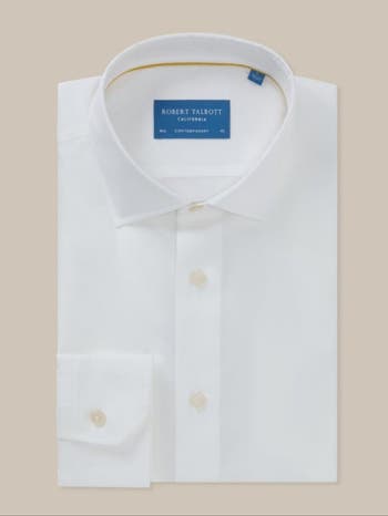 The Reynolds Dress Shirt combines thoughtful design with modern craftsmanship. Tailored to bridge the gap between business and casual, it features an edge-stitched Monterey collar with removable stays, a French placket, and a rotated armhole for style and functionality. With single-needle tailoring, mitered cuffs, and easy-care, Oeko-Tex certified fabrics, it’s built for durability and all-day polish. Signature Talbott gold piping and composite buttons make it a wardrobe foundation. Choose from contemporary or classic fits.