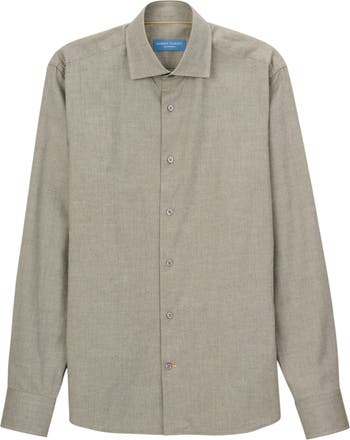 Laid-back comfort, tailored with precision. The Reynolds Ultra Lightweight Brushed Herringbone Shirt is crafted from 100% cotton with a soft brushed finish and subtle herringbone texture. Light enough for layering, yet refined enough to stand on its own, it’s designed with a Monterey semi-spread collar, French placket, and single-needle tailoring. Finished with signature Robert Talbott details, including gold piping at the inside neck, contrast thread at the bottom buttonhole and sleeve placket, and a contemporary fit for everyday ease.