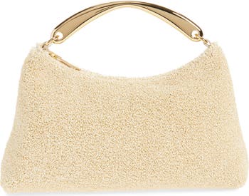 This compact bag blends soft, slouchy sophistication with modern functionality. Crafted in Italy from faux raffia, it features a single compartment and a striking polished metal handle that adds a sculptural touch.
