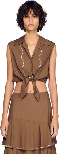 Sleeveless cropped shirt with a gathered hem and tie front, embellished with rhinestone waves.