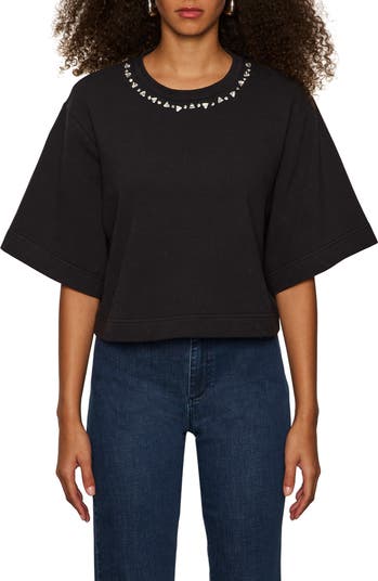 A waist-skimming cut and a row of rhinestones at the crewneck elevate a staple T-shirt made from pure organic cotton.