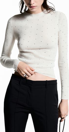 Rhinestones shimmer and shine against a figure-flaunting sweater with a posh mock neckline.