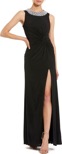 Crafted from soft jersey, this sleek gown features a high neckline, sleeveless design, twist and ruched waist, embellished neckline, and a daring thigh-high slit, perfect for any glamorous evening event.