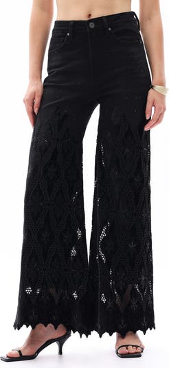 Your favorite standby jeans get a fancy-pants update in this wide-leg style, which starts in classic denim studded with a mix of rhinestones and then shifts to panels of intricate embroidery with coordinating eyelets.