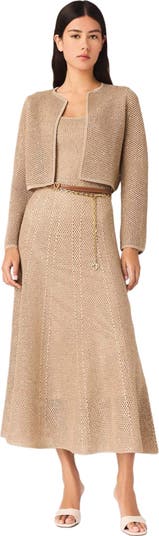 A breath of sophistication brightens up this season, with an interplay of sheer details and subtle sparkle.This cropped openwork knit cardigan, enhanced with fine sequins and denser plain trim, creates a straight, airy silhouette. Its balloon sleeves and gold fastening add a precious touch. For a coordinated look, team it with the matching dress and add a few belts to define the waist.