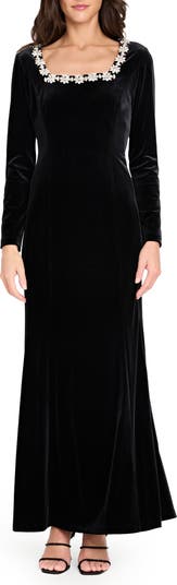 Luxurious velvet enhances the glamour of this figure-skimming gown accented with floral-cut crystals shining at the neck.