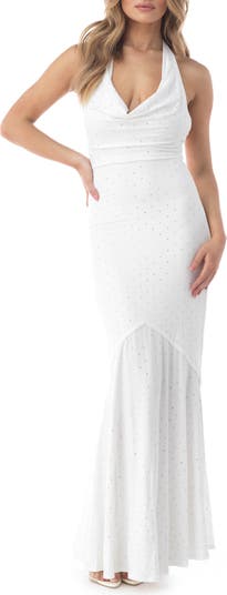 Sparkle with confidence in this rhinestone-adorned halter gown featuring a dramatic open back and a curve-loving silhouette that’s pure sophistication.
